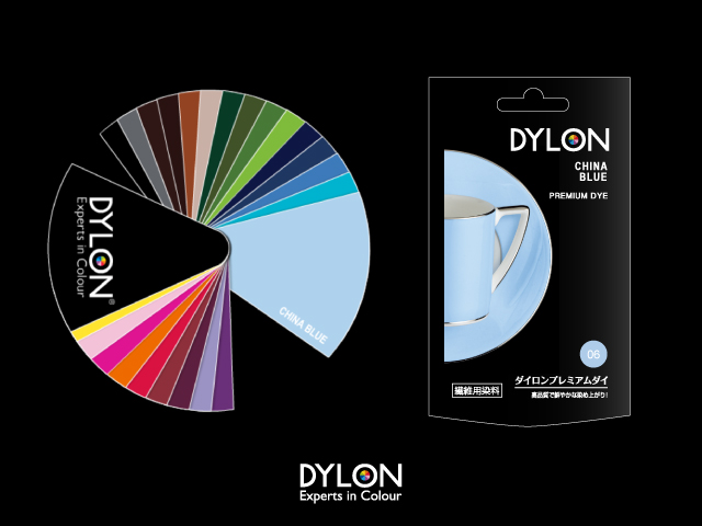 染めるのに使ったダイロンの色はチャイナブルー。きれいな水色に染まるらしいです。写真は旧パッケージ。