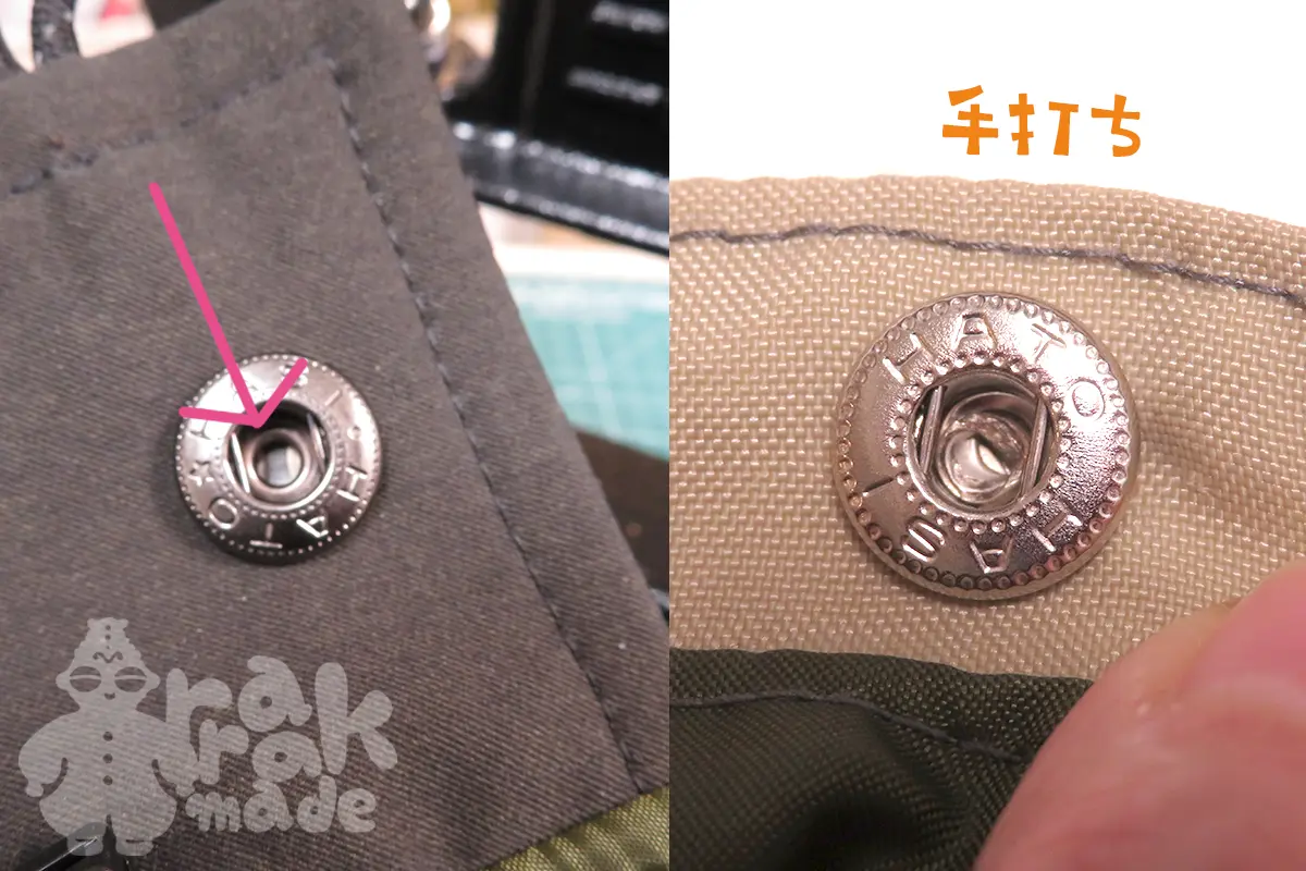 手打ちでのバネホック打ち、成功率がとてつもなく低かったです。凸側のボタンは簡単なんですが、凹側(メス側)が難しかったです。まっすぐ打てなかったです。