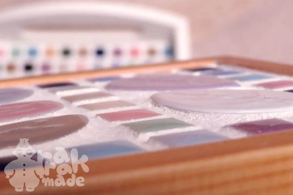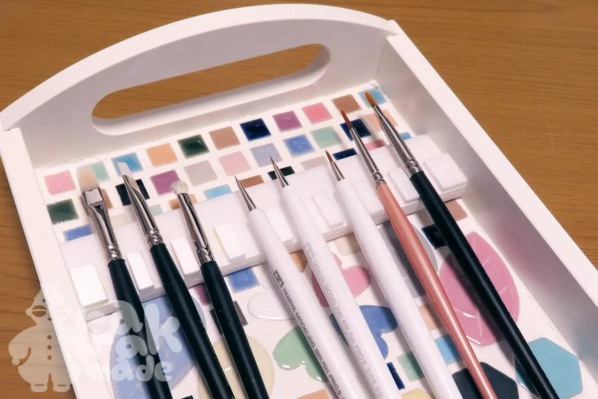 筆先が傷まないように、箸置き的な台を工作して、トレーの中に設置しています。