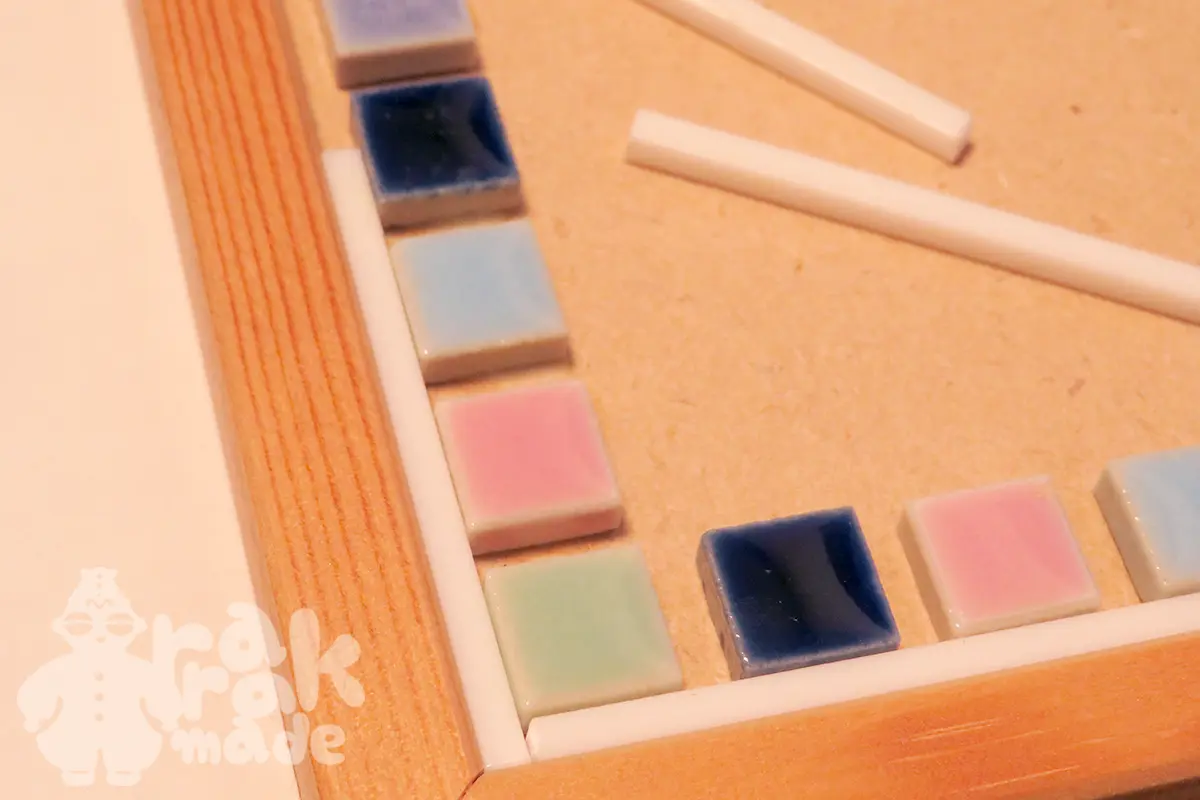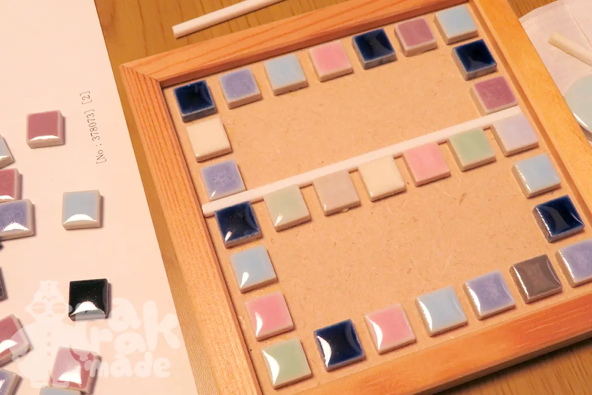 このフレーム、リバーシブルで使えて表と裏と違う並べ方でタイルを貼る事もできるようですが、作るにあたっては、目地材を埋めるタイミングが難しそうです。