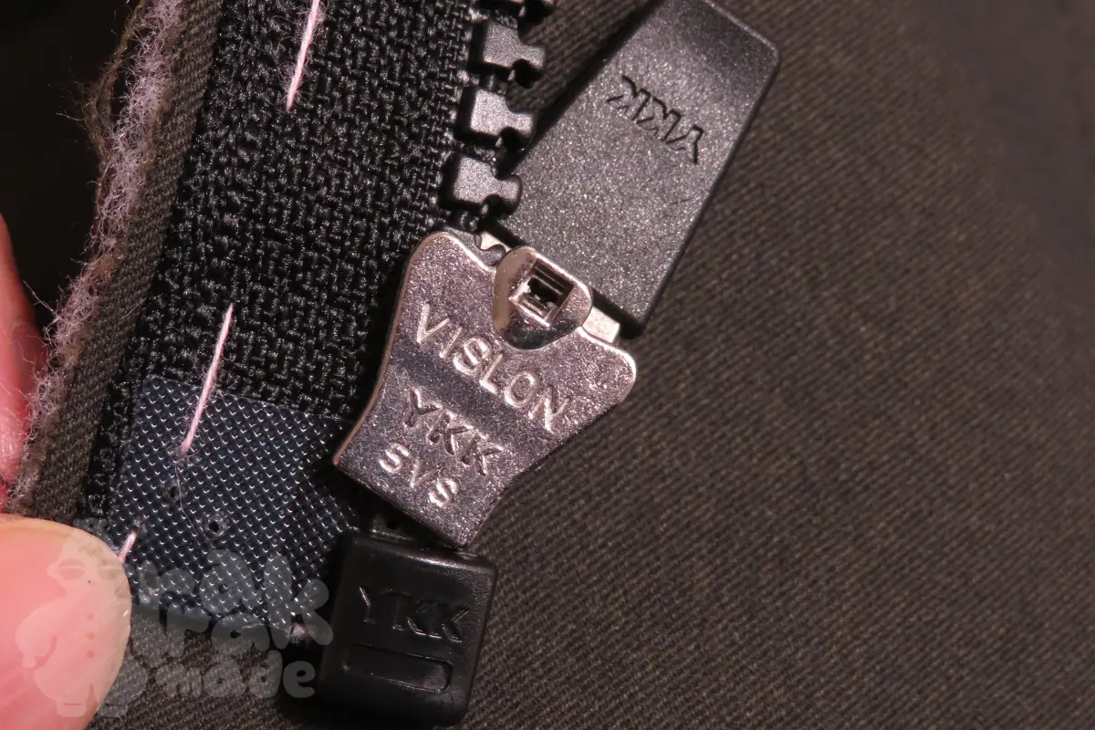 写真の引き手(スライダー)は、DS5YGというもの。スプリングで引き手の位置が固定されているセミオートマチックタイプです。引き手を下げるとロックがかかり、起こすとロックが解除されて、ファスナーがずるずる開く事がなくて安心。で、引っ張る部分がラバーグリップで寒い時も冷たさ軽減するといいなあ的なチョイスです。見た目もかっこいいと思う。