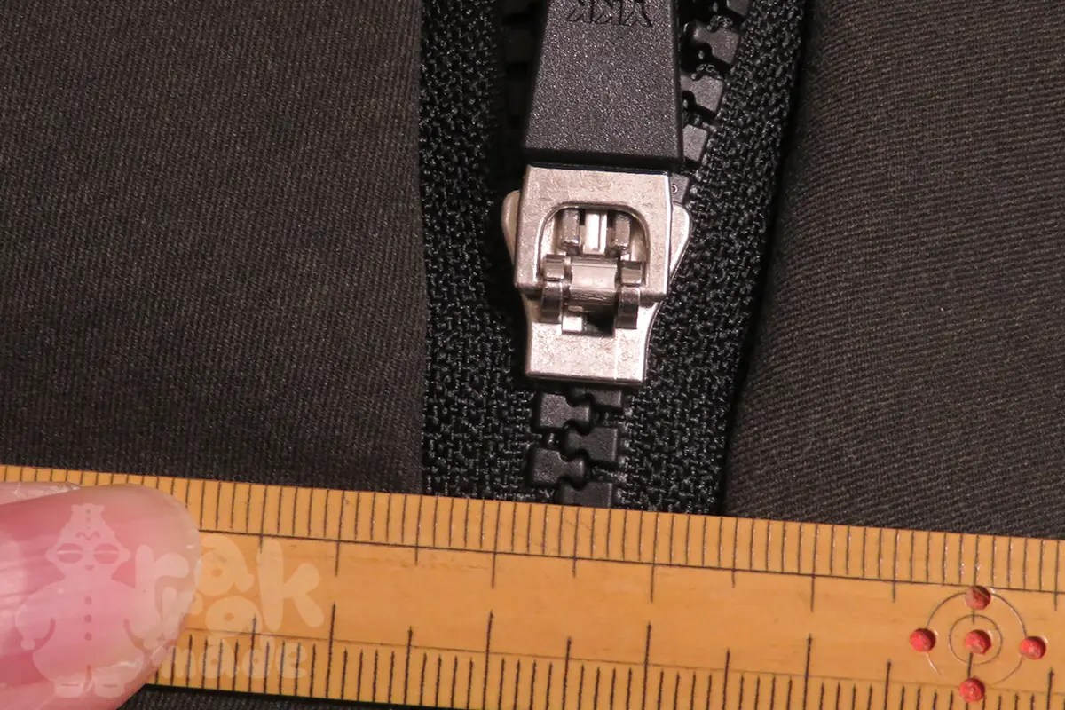 ファスナーの太さというか大きさを確認するには、ファスナーの引き手(スライダー)の裏側に刻印があるので、それを確認します。YKKの国内シェアは90%を超えているので、大体はそれで確認できると思います。