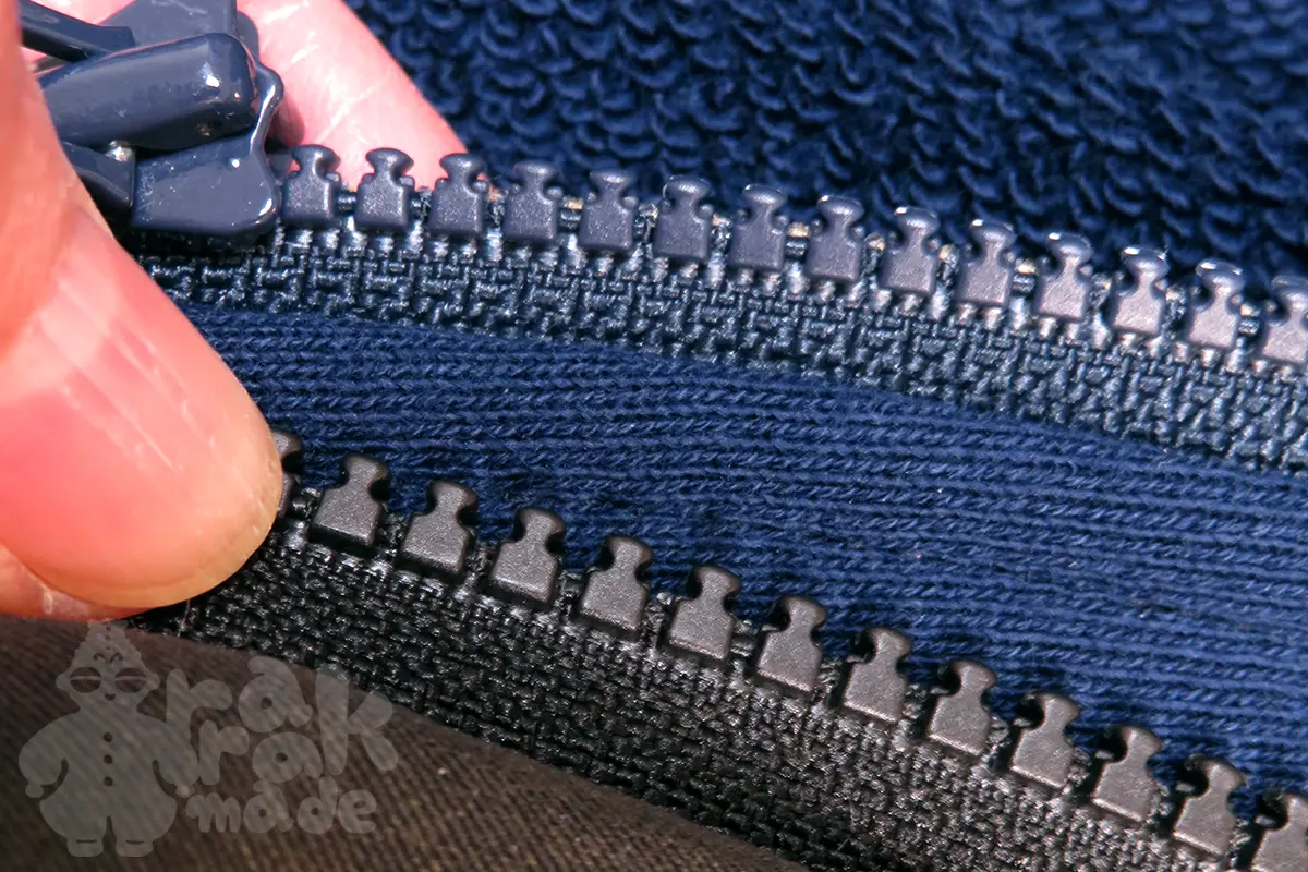 一般的な気持ち薄手のパーカーとかフリースのトップスとかに使われているファスナーです。柔らかめのトレーナー生地とのなじみが良いです。コイルファスナーよりは固い感じがします。